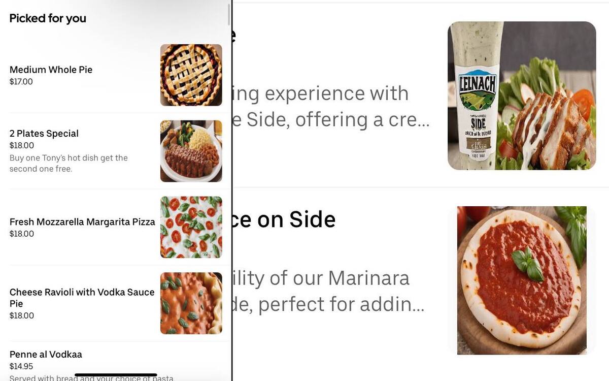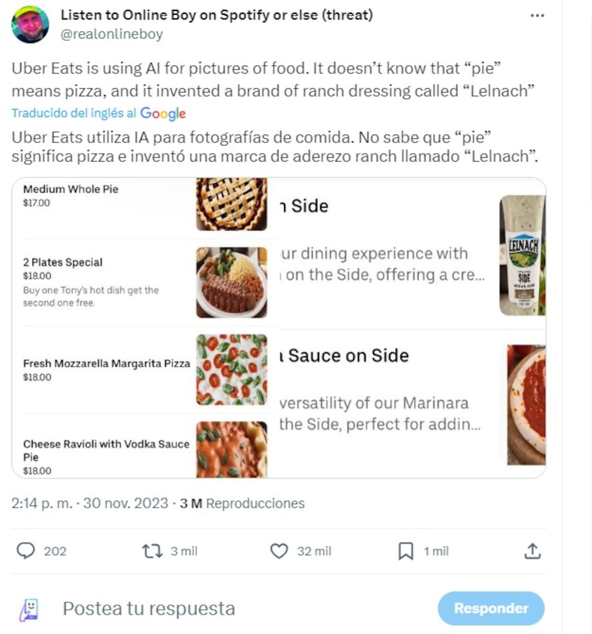 “Uber Eats está usando fotografías de IA de comida. No sabe (la IA) que “pay” significa pizza, e inventó una marca de aderezo Ranch llamada Lelnach”, afirmó el usuario @realonlineboy.