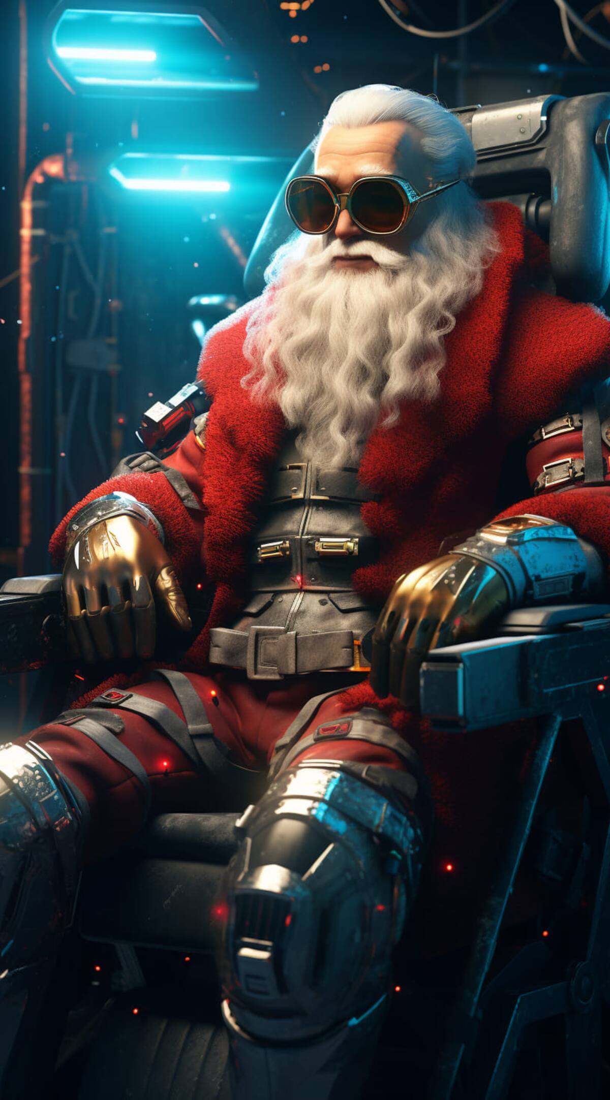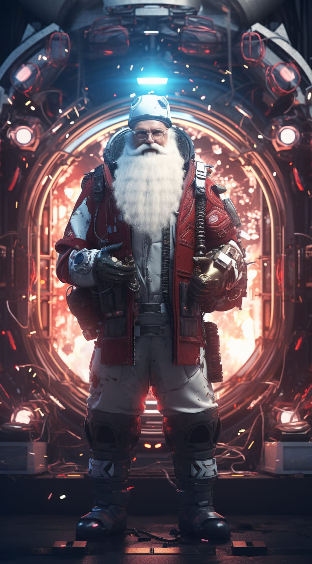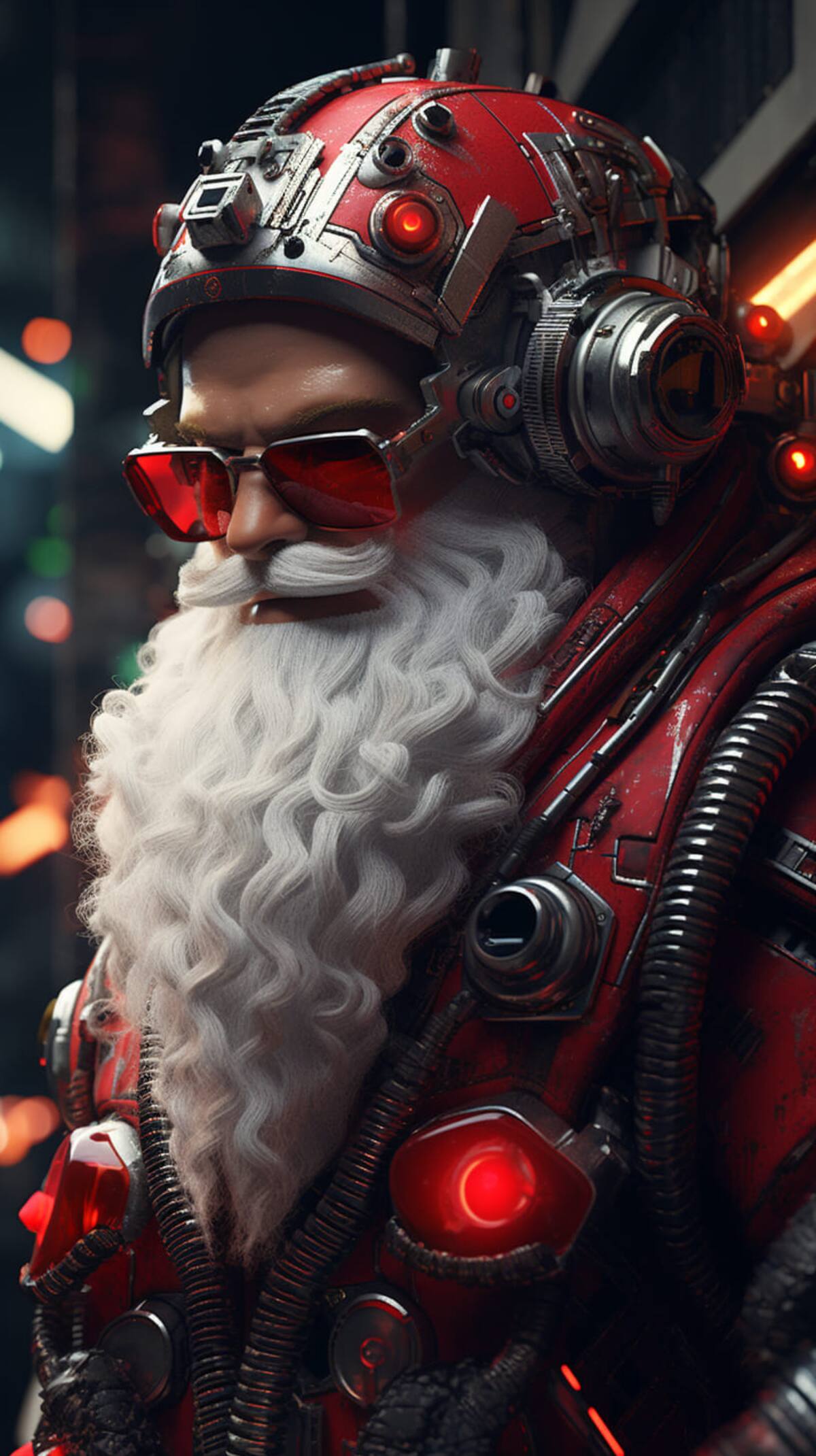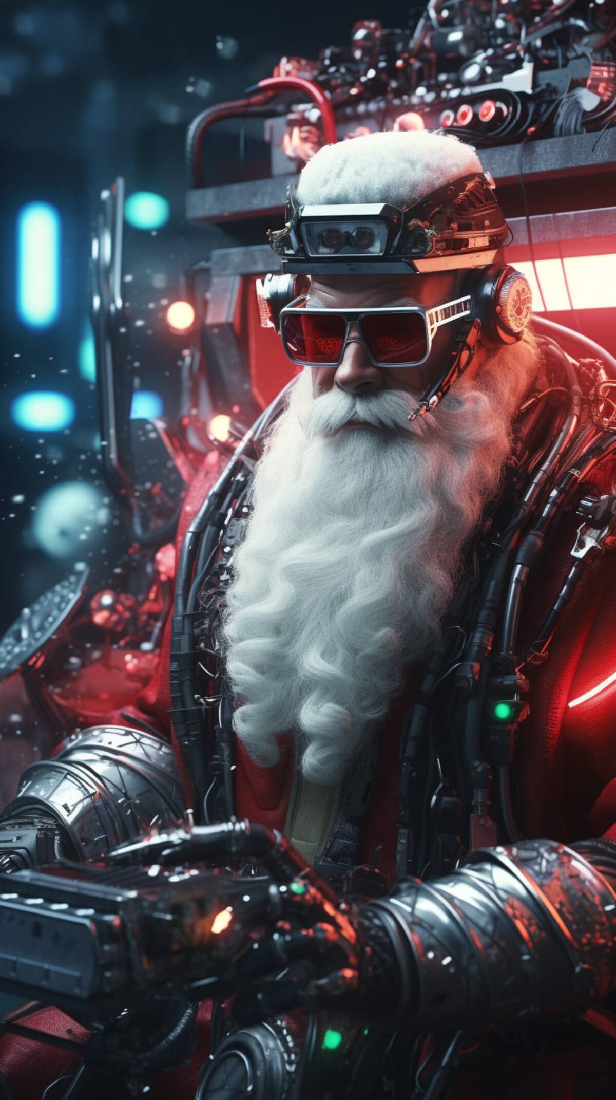 El resultado es una imagen que muestra a Santa Claus con un aspecto muy diferente al tradicional. Su rostro está cubierto por una máscara metálica que le da un aire de misterio y de poder. Sus ojos brillan con un color azul eléctrico que contrasta con el rojo de su traje, que también tiene elementos cibernéticos como cables, luces y circuitos.