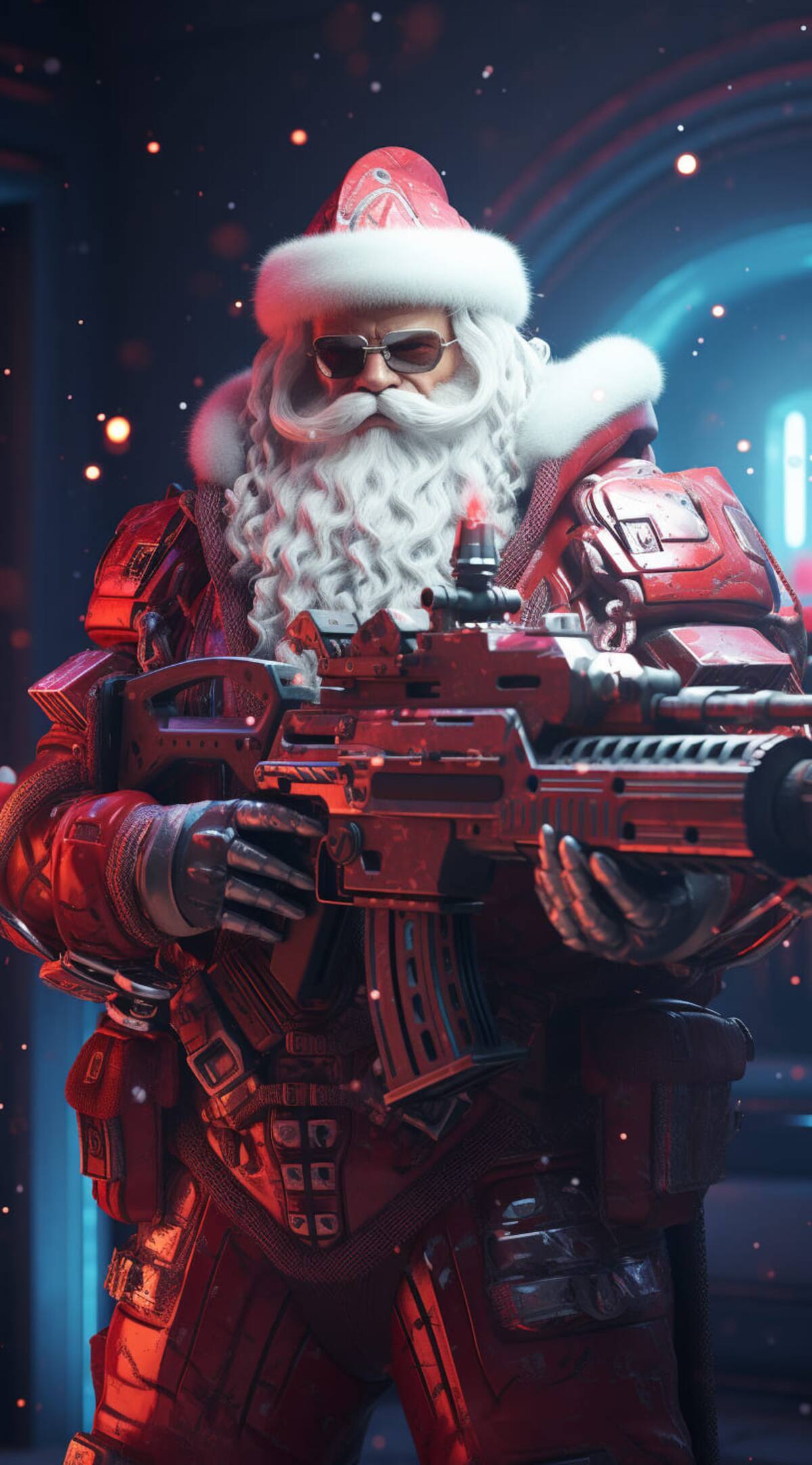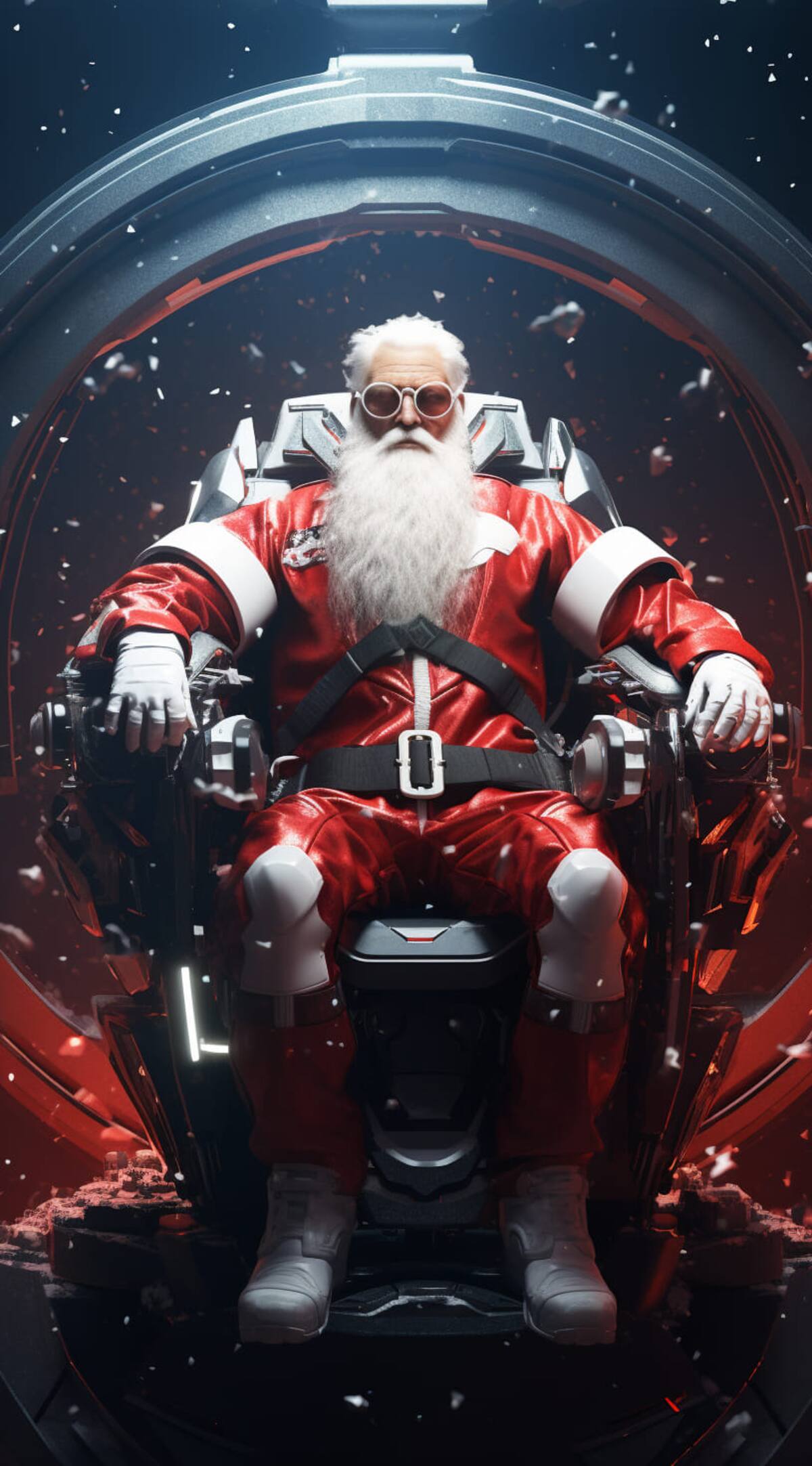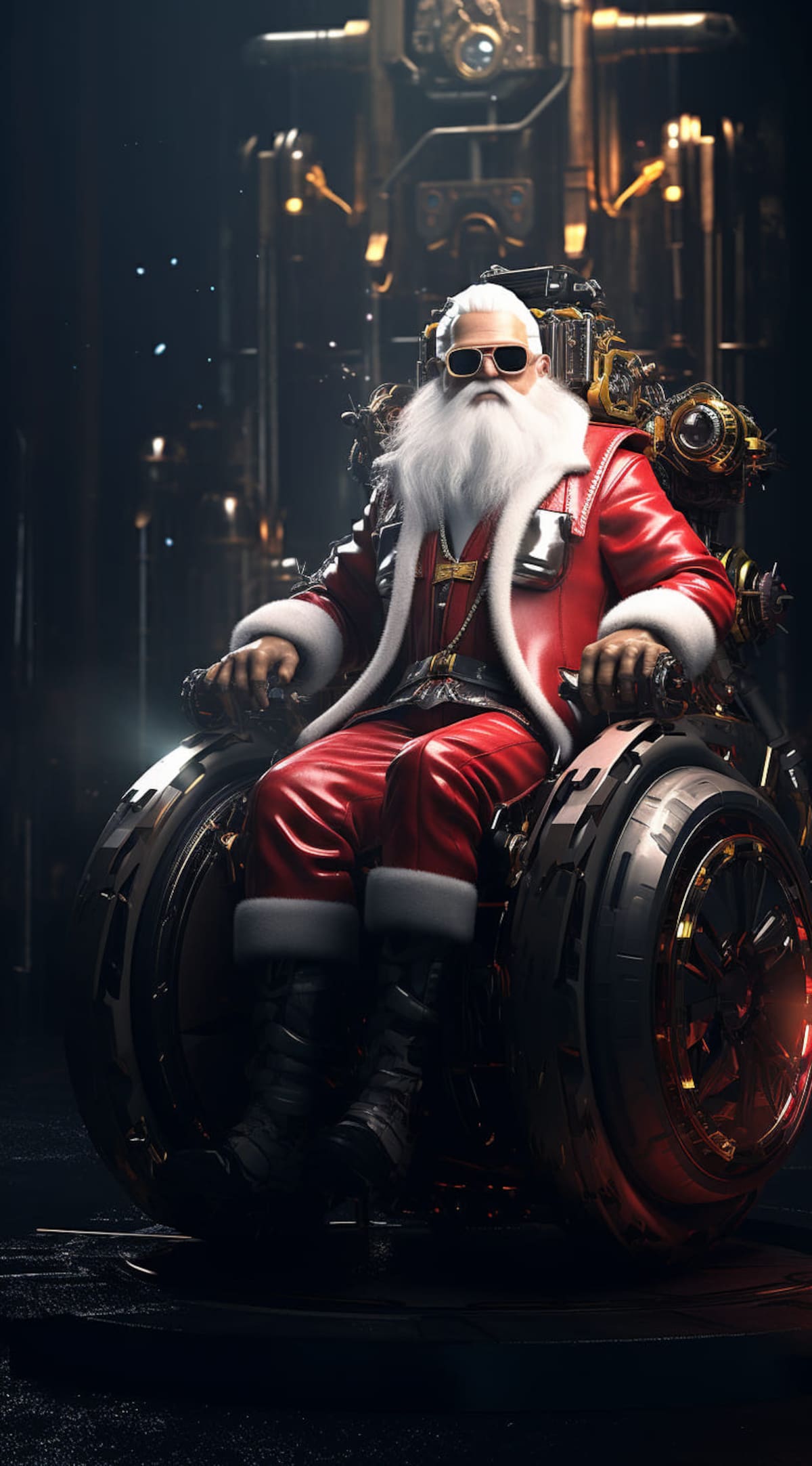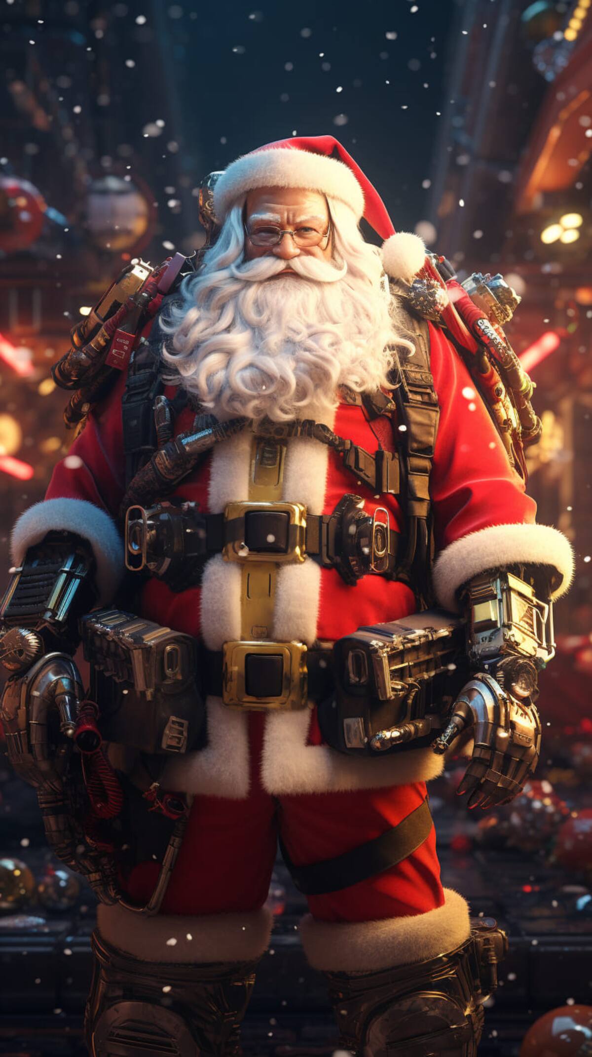 El resultado es una imagen que muestra a Santa Claus con un aspecto muy diferente al tradicional. Su rostro está cubierto por una máscara metálica que le da un aire de misterio y de poder. Sus ojos brillan con un color azul eléctrico que contrasta con el rojo de su traje, que también tiene elementos cibernéticos como cables, luces y circuitos.