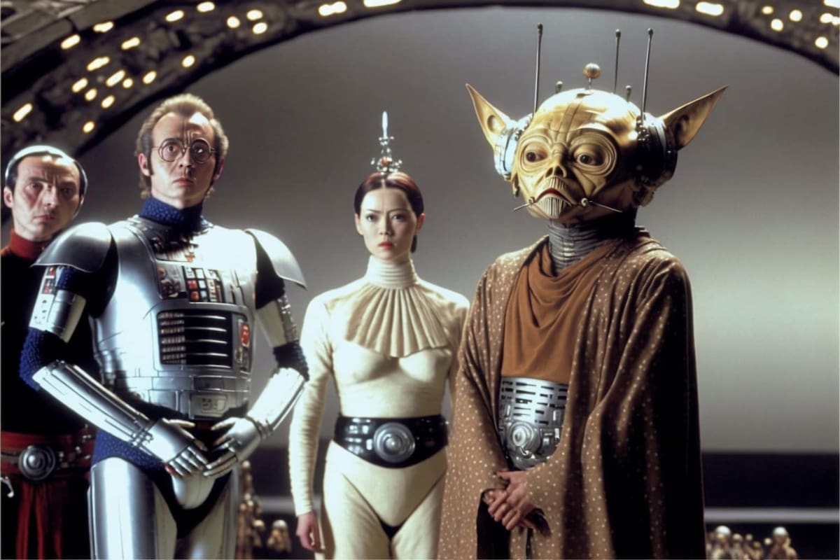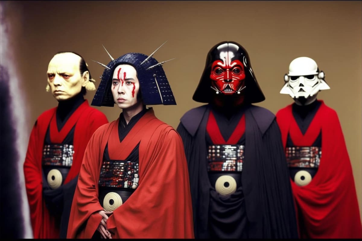 Pero Star Wars no solo ha inspirado a los creadores de productos comerciales, sino también a los de obras artísticas. Un ejemplo de ello es el trabajo del usuario Gary Reckard, que ha utilizado Midjourney, una herramienta de inteligencia artificial que genera imágenes a partir de texto, para crear una serie de lienzos que muestran cómo se vería Star Wars en estilo Kabuki.