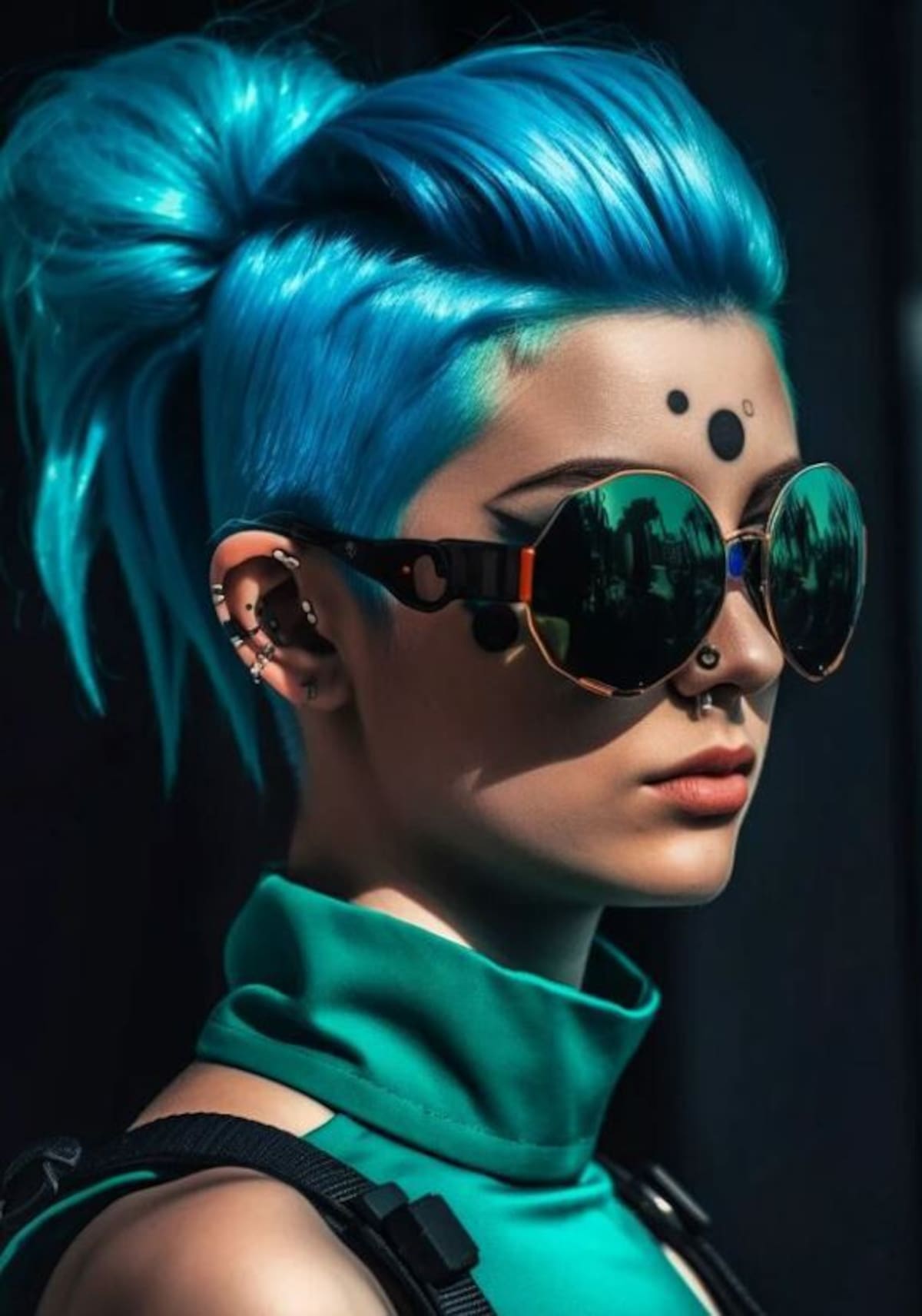 Esta pieza ilustrativa se distingue por su enérgica cresta capilar, las gafas rojas y el tatuaje decorando su mejilla, elementos que evocan una estética semejante a la presente en Cyberpunk 2077.