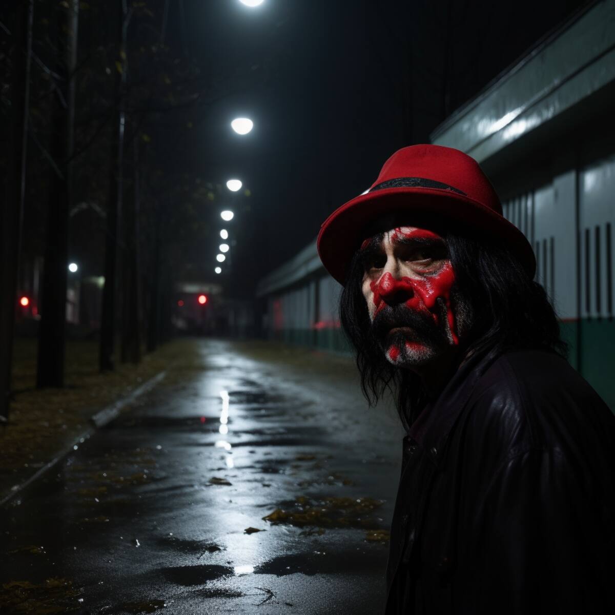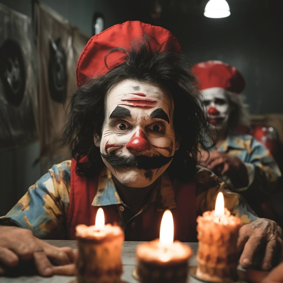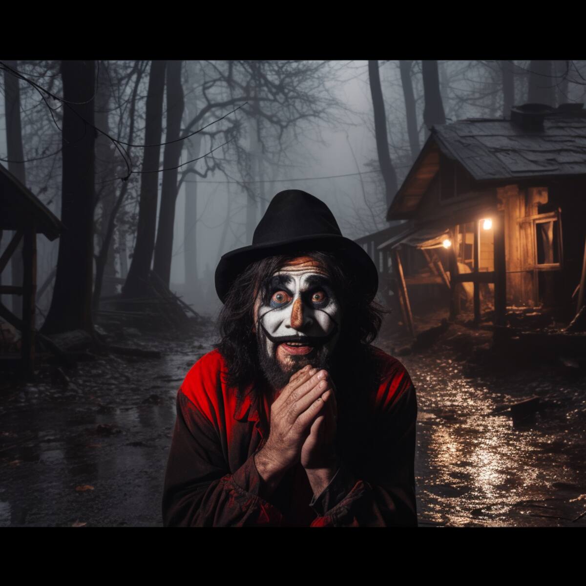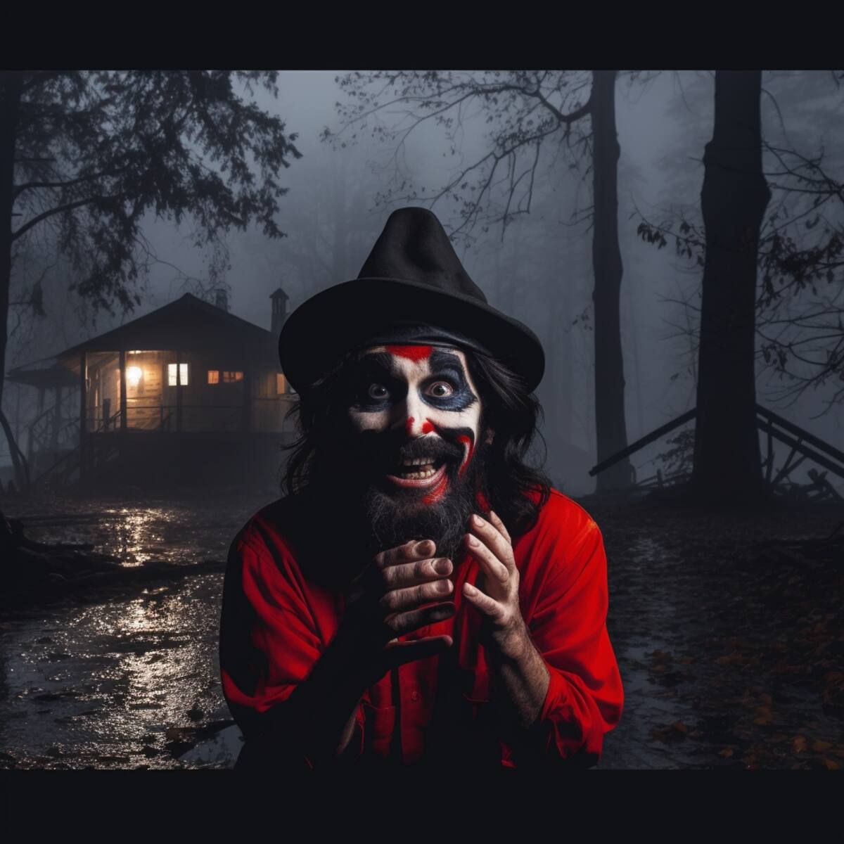 En estas creaciones, creadas con la herramienta de Midjourney, vemos a Cepillín con un diseño más tétrico, pero inspirado en su maquillaje tan característico, acechando en escenarios terroríficos, como una cabaña lúgubre en medio de una noche oscura.