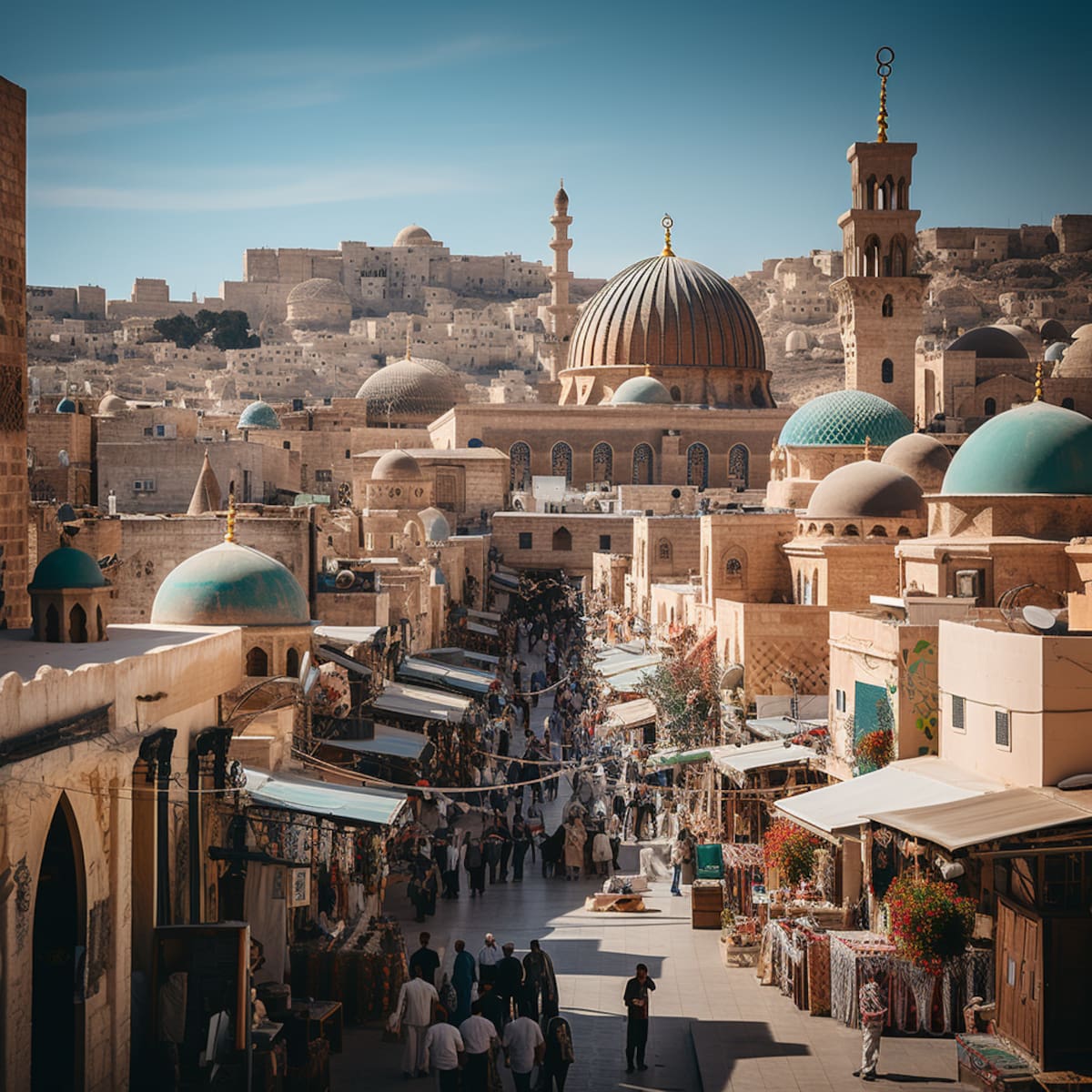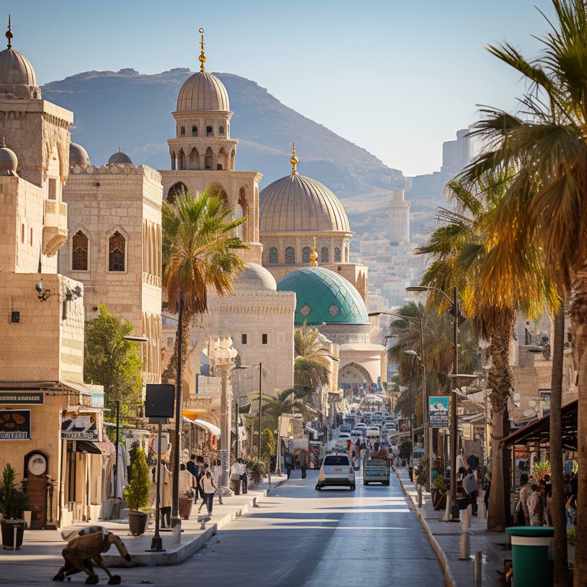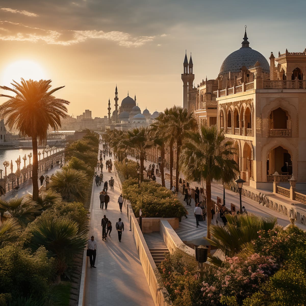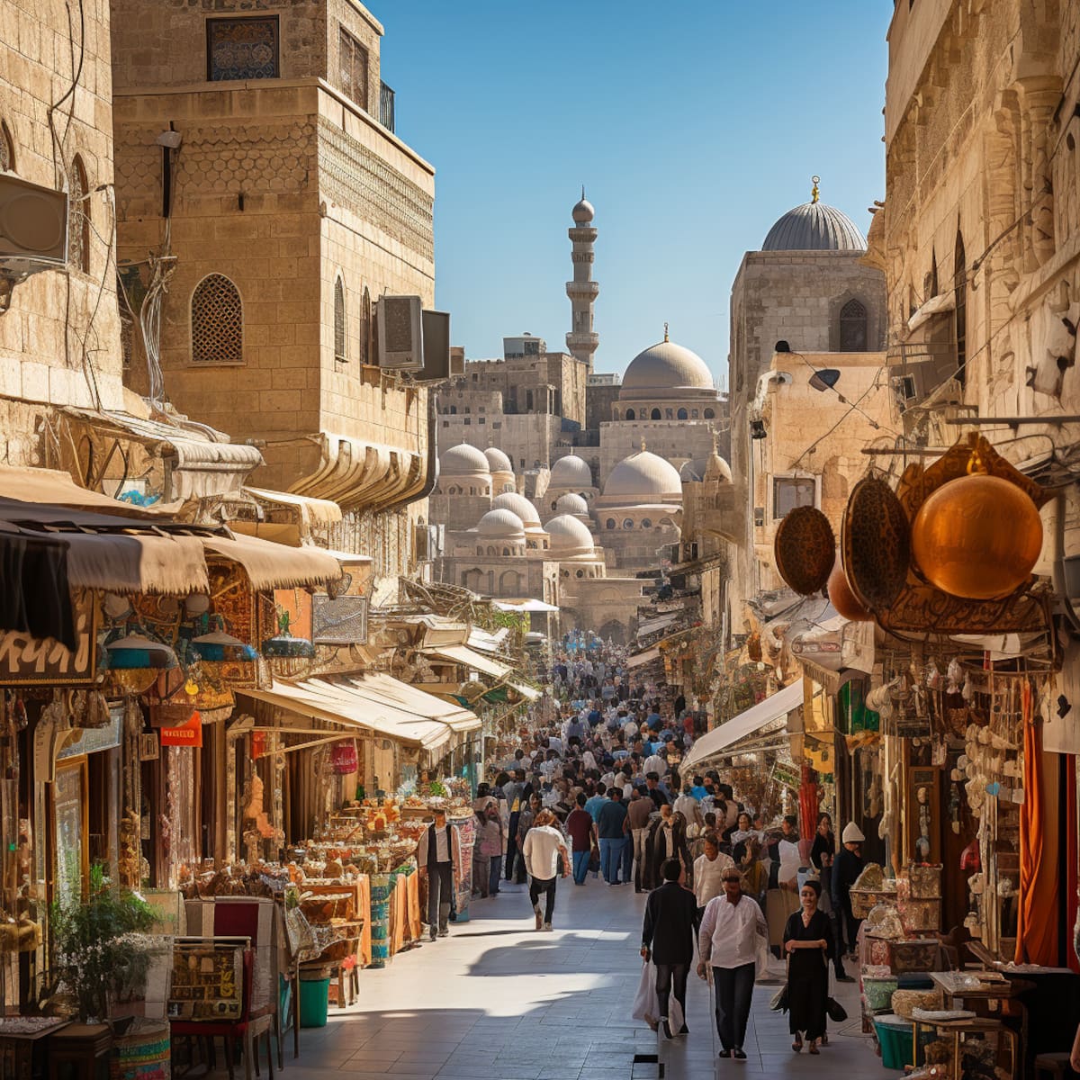 Un país de Oriente Medio con ciudades donde lo antiguo y lo moderno conviven, con mezquitas, iglesias y sinagogas que se alzan una al lado de la otra, donde las cúpulas, los arcos y los minaretes se mezclan con los rascacielos, los puentes y los parques, una ciudad donde las calles son animadas y coloridas, donde los mercados, los cafés y las tiendas ofrecen una variedad de productos y servicios, donde el arte, la cultura y la educación florecen. Una ciudad donde la brisa del mar trae frescura y vitalidad, donde las playas son limpias y acogedoras, donde las puestas de sol son impresionantes e inspiradoras, una ciudad donde el futuro es brillante y esperanzador.