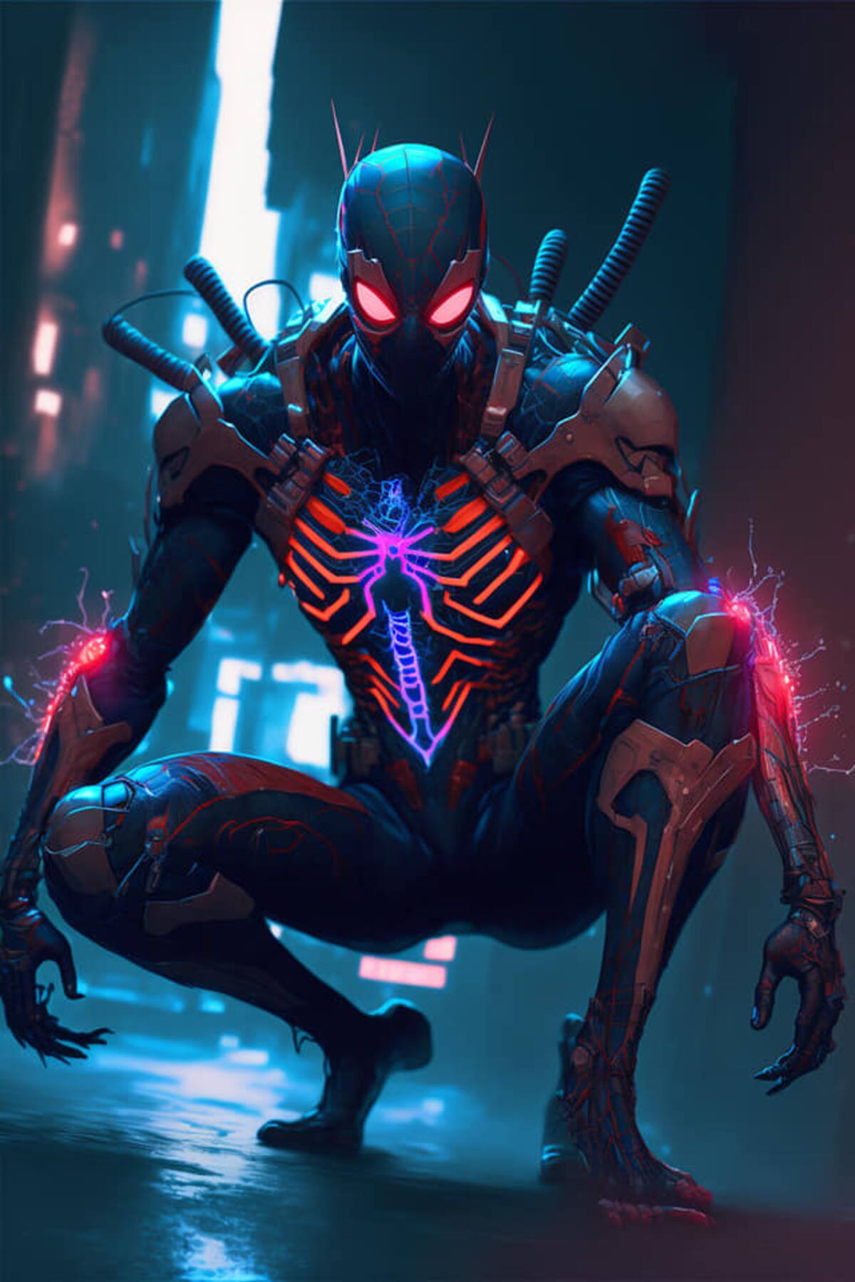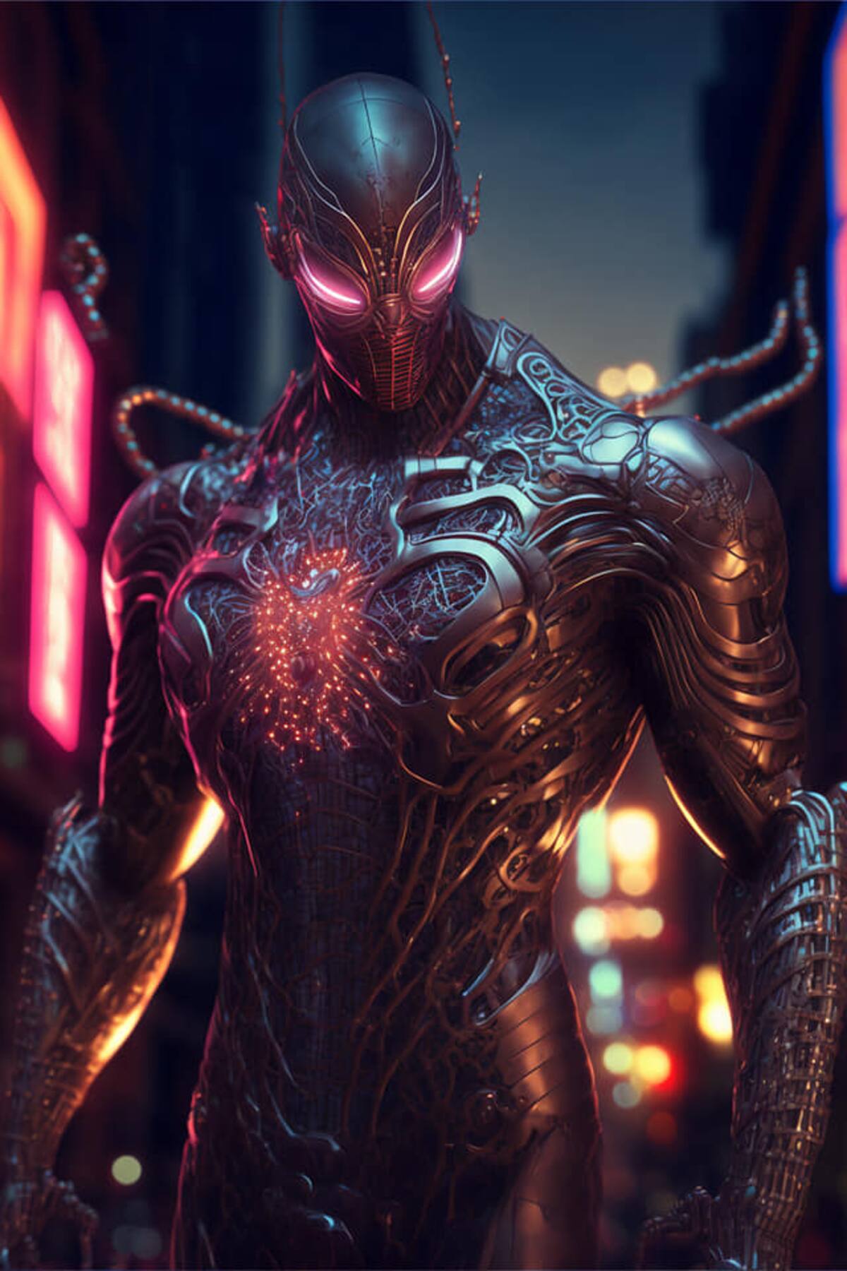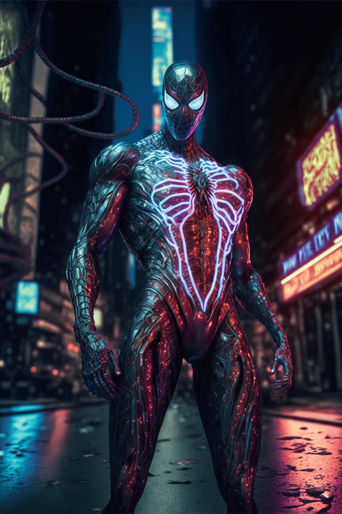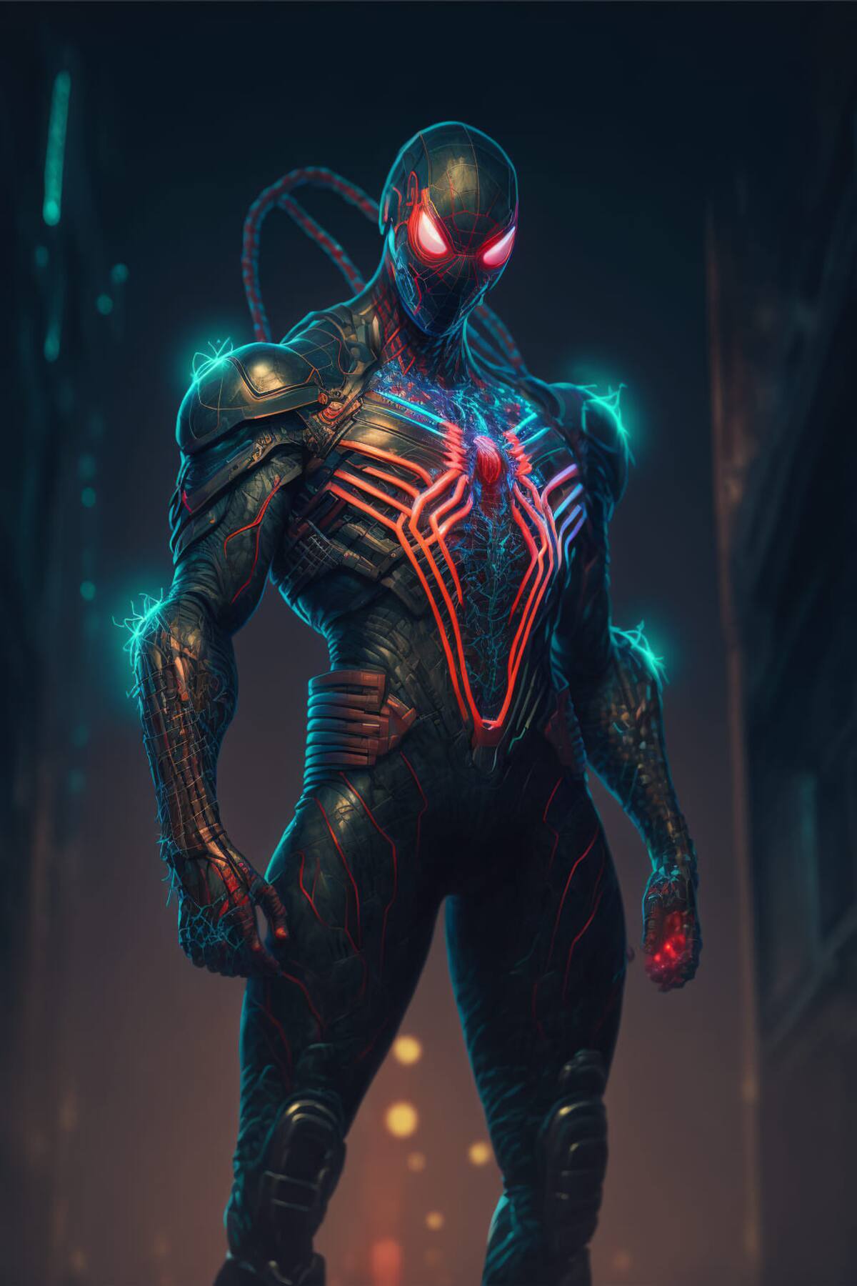 En la imagen se puede apreciar a Spiderman con un traje negro y rojo, lleno de detalles tecnológicos como cables, luces y circuitos. Su máscara tiene unos lentes cibernéticos que le permiten ver información digital y comunicarse con otros dispositivos. Su mano derecha sostiene una pistola láser, mientras que su mano izquierda dispara una telaraña metálica. El fondo muestra una ciudad nocturna, iluminada por neones y hologramas, donde se ven rascacielos, vehículos voladores y carteles publicitarios.