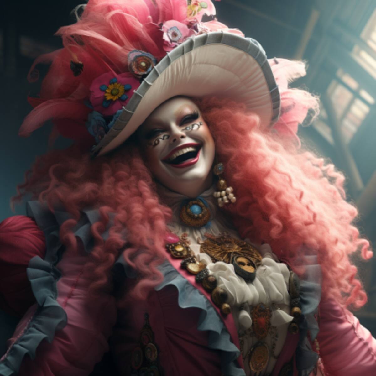 El resultado es sorprendente: la imagen muestra a una mujer mayor, con rasgos caucásicos y una expresión severa. Su pelo sigue siendo rosa, pero más apagado y con algunas canas. Sus ojos son azules y penetrantes, y su boca tiene labios gruesos y dientes blancos. Su cuerpo es corpulento y voluminoso, pero no tanto como en el manga. Lleva un vestido azul con rosa y un sombrero a juego, adornado con flores.