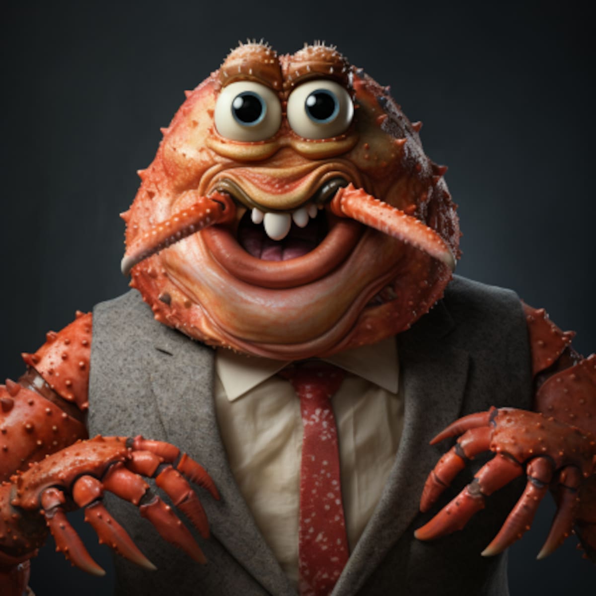 El resultado es una imagen divertida y sorprendente, que nos muestra cómo sería Don Cangrejo si fuera un animal real. La imagen tiene un estilo realista, pero también conserva algunos rasgos caricaturescos del personaje original. Se puede apreciar el contraste entre su cuerpo de cangrejo y su ropa de humano, así como su gesto de emoción.