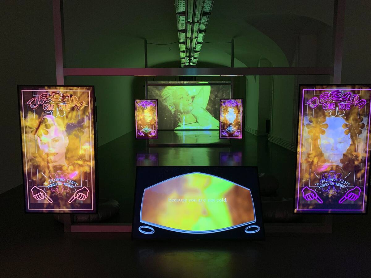 Como si se tratara de una película futurista, LaTurbo Avedon, con corte de pelo corto y rubio platino, se dirige a los visitantes hablando en lenguaje inclusivo desde una gasolinera inundada, proyectada en la pantalla, de donde comienza y termina la simulación.