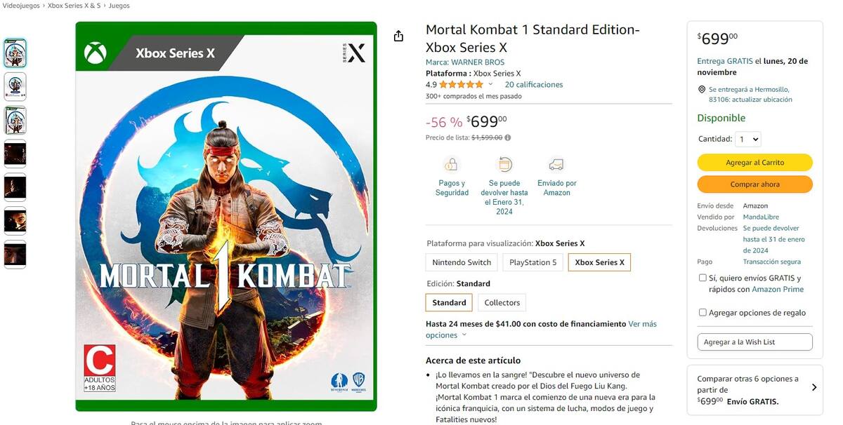 Normalmente, este juego cuenta con un costo de 1599 pesos mexicanos, de acuerdo a lo que registra el sitio especializado en rastrear ofertas, Keepa, por lo que estaríamos hablando de un descuento de 900 pesos, dejando al juego en formato físico en tan sólo 699. ¿La parte más ridícula? Si cuentas con tarjeta de crédito, pues pagarlo en mensualidades de hasta 41 pesos por 24 meses, gracias a las opciones de pago de Amazon.