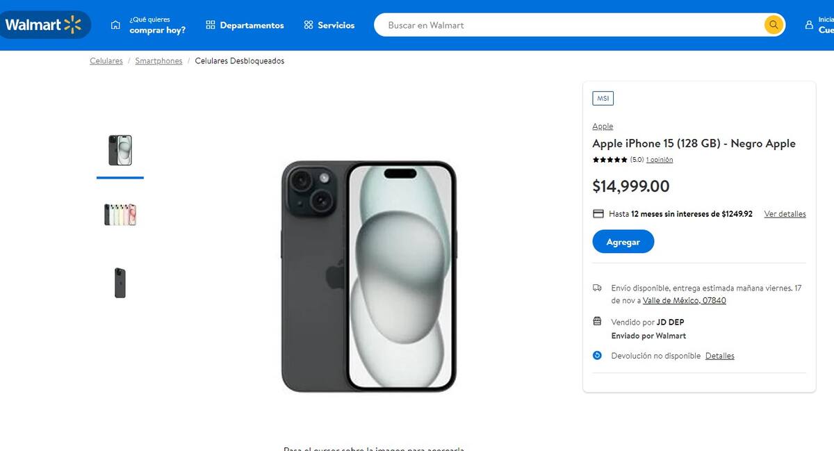 La competencia entre tiendas de todo México se ha intensificado conforme arrancamos el periodo de ofertas del Buen Fin 2023, prueba de ello es la reciente promoción que detectamos en Walmart, donde un iPhone 15, el más reciente producto de la línea de smartphones de Apple, alcanza un precio ridículod de 14,999 pesos mexicanos.