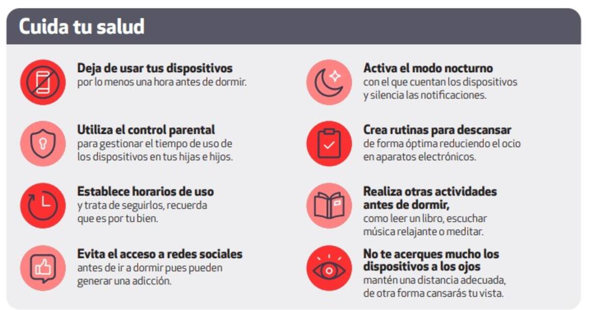 Algunas de las acciones inmediatas para que tu equipo no tenga un efecto perjudicial en tu salud están el dejar de usarlos mínimo una hora antes de acostarte, usar controles parentales, seguir un horario de uso, no acceder a redes u otras aplicaciones adictivas poco antes de dormir, encender el modo nocturno, fortalecer una rutina de sueño sin el teléfono, hacer otras actividades como leer o escuchar música relajante y sobre todo, no acercar tu teléfono a tus ojos.
