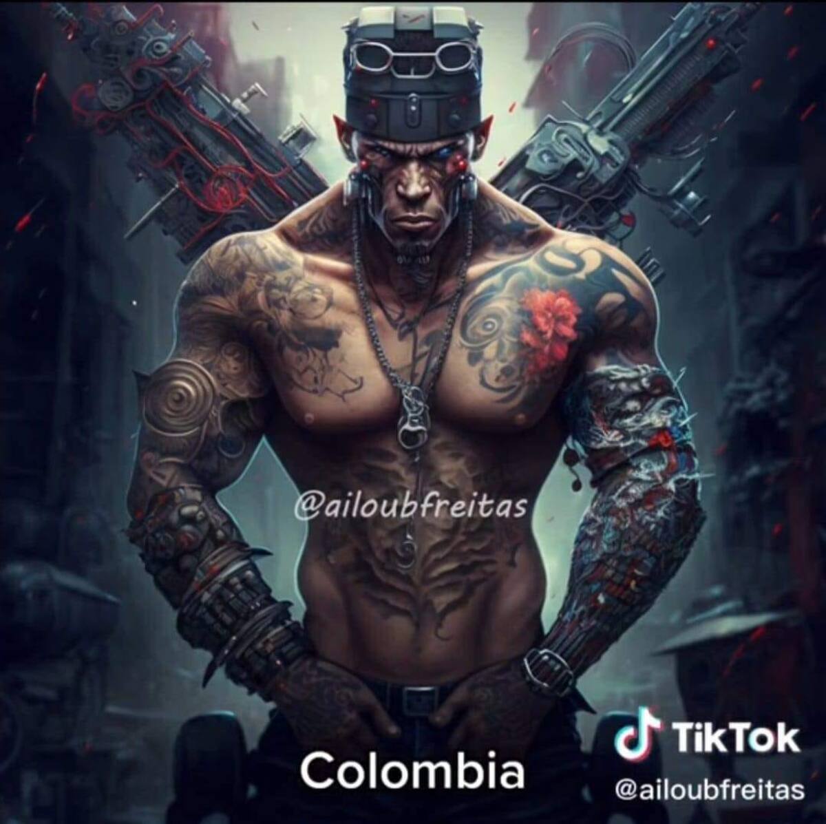En Colombia, la inteligencia artificial representó a su villano como un humanoide robótico que está cubierto de tatuajes.